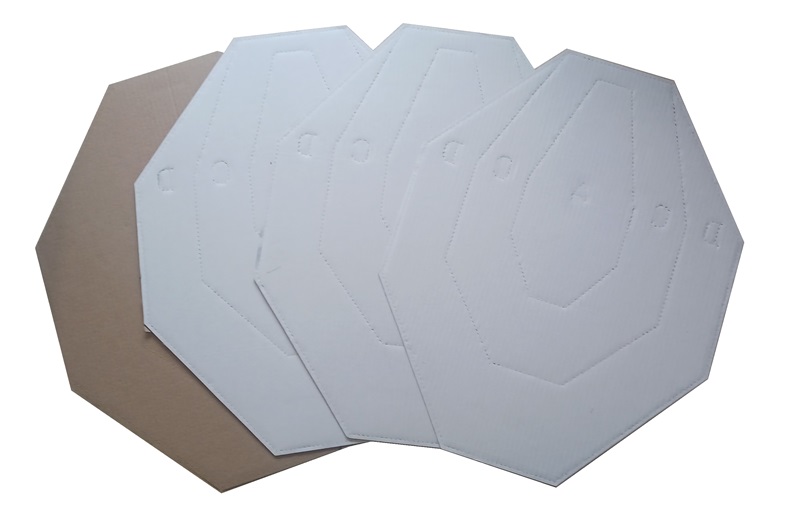 Aaltopahvista valmistettu standardin mukainen Practical/IPSC ampumataulu harjoituskäyttöön ja urheiluammuntaan. Osuma-alueet ovat merkattuna tauluun.